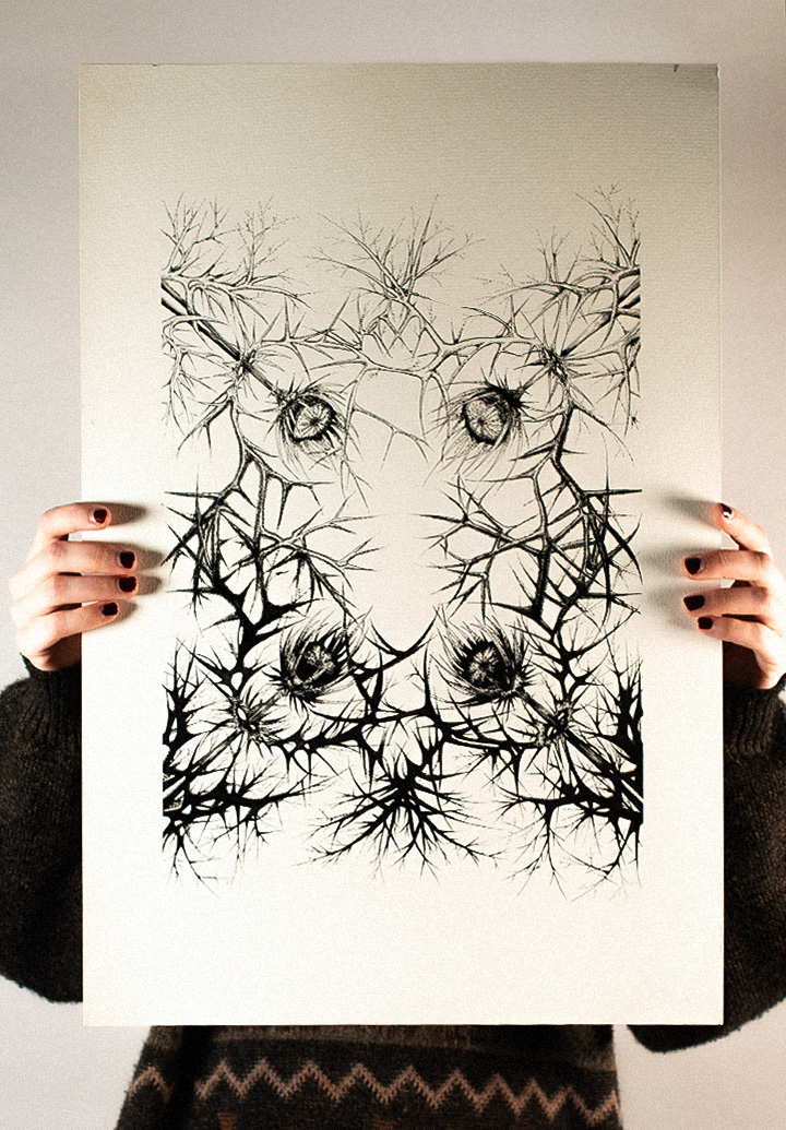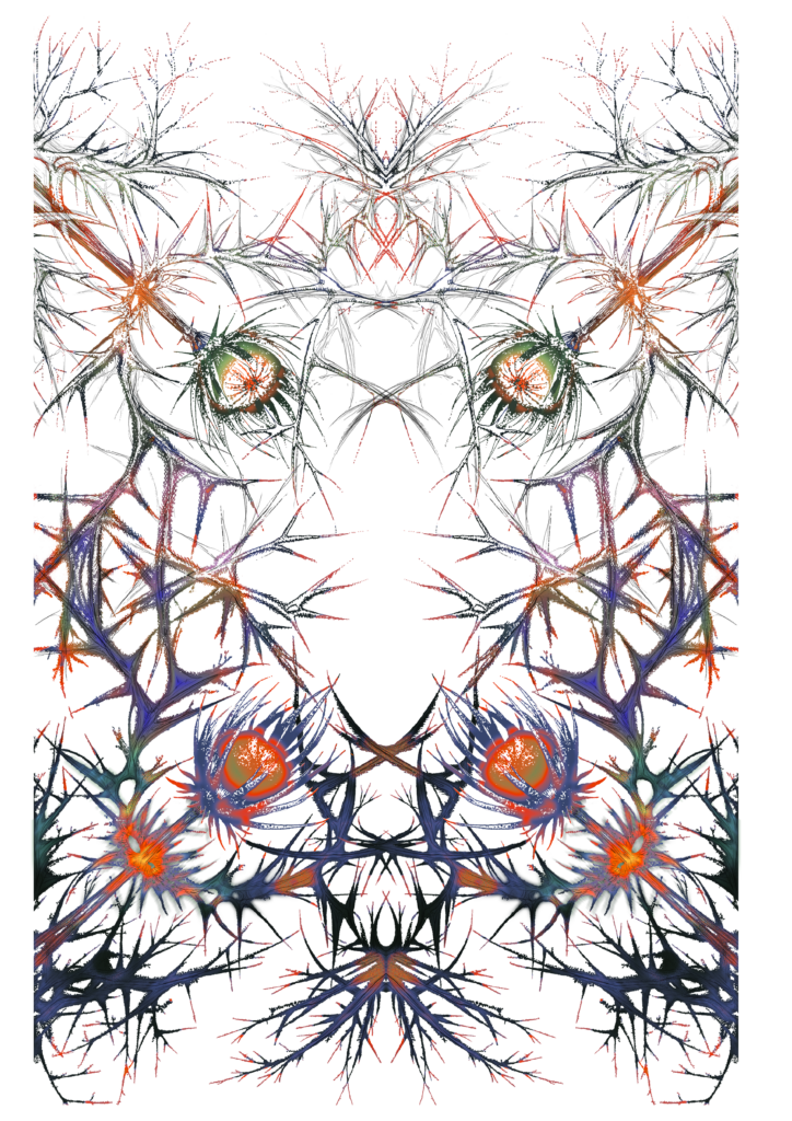 C'est un organisme sensible paré à protéger son cœur floral. Pour moi, cette œuvre incarne une forme de résilience : une beauté qui ne peut exister qu’enveloppée de défenses. Les épines réagissent et protègent tandis que les noyaux floraux s’ouvrent lentement, comme un souffle.