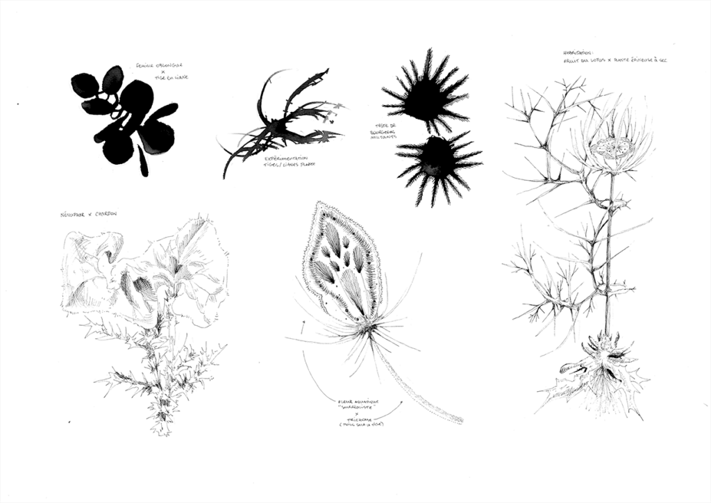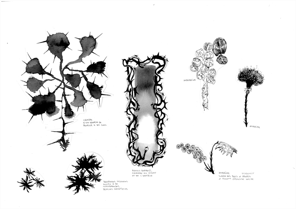 mettant en dialogue des croisements potentiels d'espèces - nées de mélange, de rencontres fortuites ou d'hybridation avec des matières inanimées -, dont les existences peuvent être interprétées comme des scénarios prospectifs.